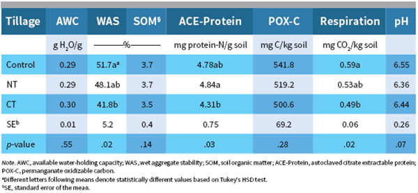 Available water-holding capacity was not statistically different between the grassland control and either conversion method (Table 1). In the driest year for the study (2017), there were virtually no differences in AWC between the tillage practices. As precipitation increased, however, tillage had a greater influence, and larger differences were observed (Table 2). Nunes et al. (2018) and van Es and Karlen (2019) also failed to measure significant effects of tillage management, which is mostly influenced by inherent soil differences (texture and mineralogy) and less by management effects.