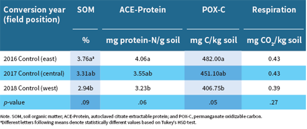 Soil organic matter (SOM) was on average always lower than the grassland control; however, no statistical differences were observed for any year of the study (Tables 3 and 2). Similarly, Grandy and Robertson (2006) found that total carbon changes were not detectable following tillage of uncultivated land. Permanganate oxidizable carbon is considered to be a more sensitive indicator to track such changes over various time periods. Similar to SOM, POX-C showed a downward trend with increasing tillage activity; however, overall, no statistical differences were found (Table 1). The decrease was most drastic during the driest year, 2017 (Table 3). Culman et al. (2012) found POX-C to be strongly correlated to other measures of soil carbon but also found that the sensitivity of POX-C to detect changes due to tillage was less robust than sensitivity to timing of sampling. Despite a general trend towards decreased POX-C with tillage, the current study found similar statistical results (Table 1). Some of this retained carbon is likely to be in the form of POX-C, which is considered to be a more labile fraction of SOM but maintains a strong correlation with SOM (Table 4).