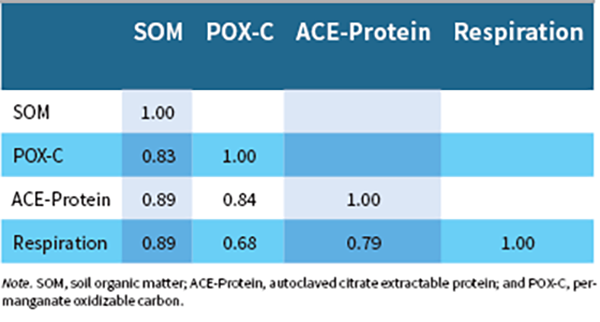 The CASH approach was selected to assess soil health during grassland conversion. The focus of the current study is based on seven soil tests that can be broken down into physical, biological, and chemical indicators. Soil samples were collected in the fall following harvest of all crops. All soil replicates were based on a composite of 8 to 12 samples taken from a depth of 0 to 6 inches according to Moebius-Clune et al. (2016). Among soil parameters measured to assess soil health changes were the soil physical properties wet aggregate stability (WAS) and available water-holding capacity (AWC); the soil biological properties soil organic matter (SOM), permanganate oxidizable carbon (POX-C), autoclaved citrate extractable protein (ACE-Protein), and soil respiration (Figure 4); and the soil chemical property soil pH. Data were analyzed statistically using R (R Core Development Team, 2014). Significance was determined at P ≤ .05 (unless otherwise stated) with means separation determined using the Tukey method. Linear correlations were determined using Pearson’s correlation coefficient.