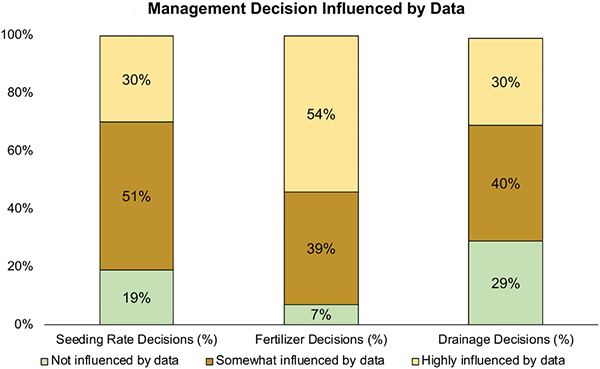 In 2017, Purdue University researchers surveyed representatives of 800 large (>1,000 ac) corn and soybean farms about their collection, analysis, and use of farm data. Ninety-three percent of respondents reported that their fertilizer decisions were “somewhat” or “highly” influenced by data (Figure 1). Eighty-one percent of respondents said their seeding rates were at least somewhat influenced by data. On smaller farms, effective data usage is undoubtedly lower.