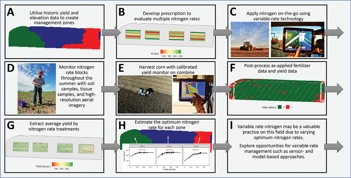 Among a variety of studies underway, the NU team currently has on-farm research experiments comparing yield from growers’ standard sidedress N approach (both flat and variable rate) and new model-based approaches such as Granular and Adapt-N. They’re exploring N use efficiency and profitability between the approaches. They’re including some small areas of lower rates than producers might be comfortable having in multiple whole-field strips in order to determine the economic optimum N rate (Figure 3).