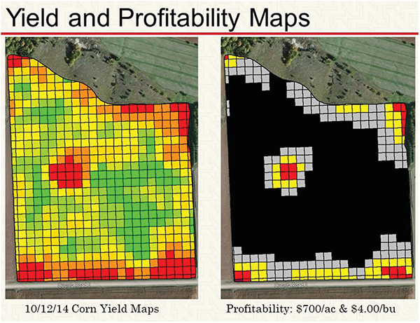Nathan Mueller is co-owner of a small farm in southeast Nebraska. He helped teach precision ag data management workshops for NU extension. He has used SMS Advanced software from Ag Leader to generate profitability maps (Figure 4) based on yield maps for his farm. Yield multiplied by the corn price equals gross revenue, and you’d subtract production costs to create a profitability map, which is especially helpful if it’s based on a multiyear yield map. Profitability maps allow the user to run scenarios, such as changing the price of corn or inputs, to see the effect on profitability.