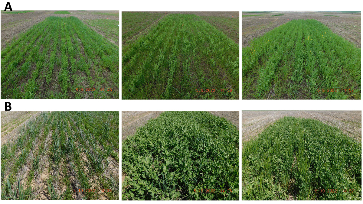In the drier 2021 season, the weed biomass was generally greater than the cover crop biomass. However, in the wetter 2022 year, cover crop production was greater and weeds were better suppressed (Tables 1 and 2). Weed infestation was typically greater in the fall-sown cover crop systems, particularly lentils, than in spring-sown cover crop systems. This difference is primarily related to the predominant weed species in the area that have a majority of their germination period in fall and winter in addition to the later weed control that happened before the seeding of the spring-sown cover crops. Weed biomass was similar in the fall mix and winter peas, indicating a similar competitive ability of these cover crops (Table 2). Weed biomass was generally similar among all spring-sown cover crop species (Table 2).