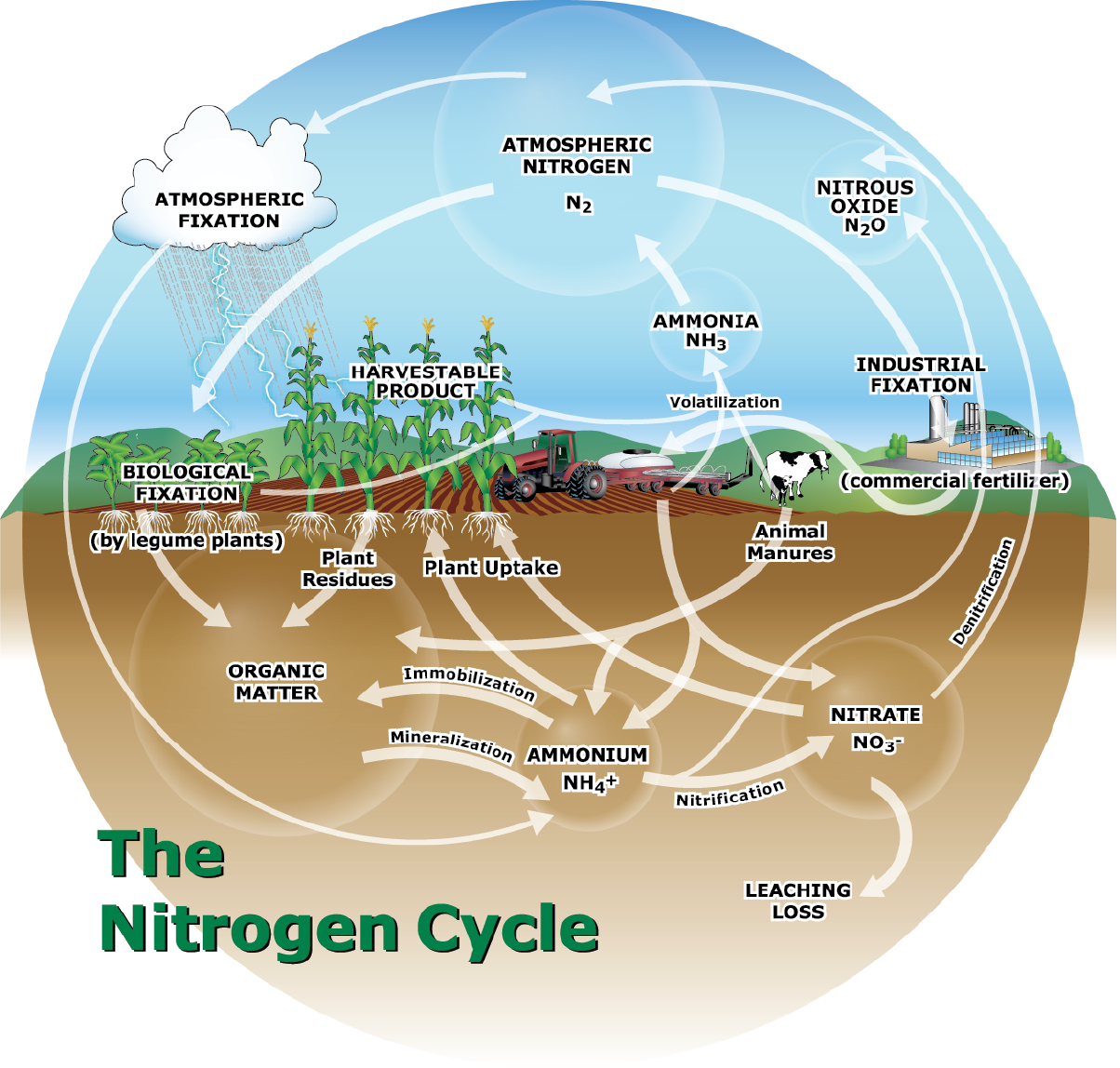 The nitrogen cycle encompasses the transformation of nitrogen as it moves through the atmosphere, soil, plants, and soil biomass. Since its recognition in the mid-19th century, the nitrogen cycle has identified organic and inorganic N sources as atmospheric, soil organic matter, N2 fixation, crop residue decomposition, biomass mineralization, clay layer release, and fertilizer additions. This is not a static system. Nitrogen will enter and exit the cycle constantly without human intervention as relatively balanced inputs and outputs. Predominant contributors that perpetuate the cycle include soil water availability, soil chemistry reactions, enzymatic reactions, aeration, temperature, weather, soil macroinvertebrates, and bacterial and fungal activity.