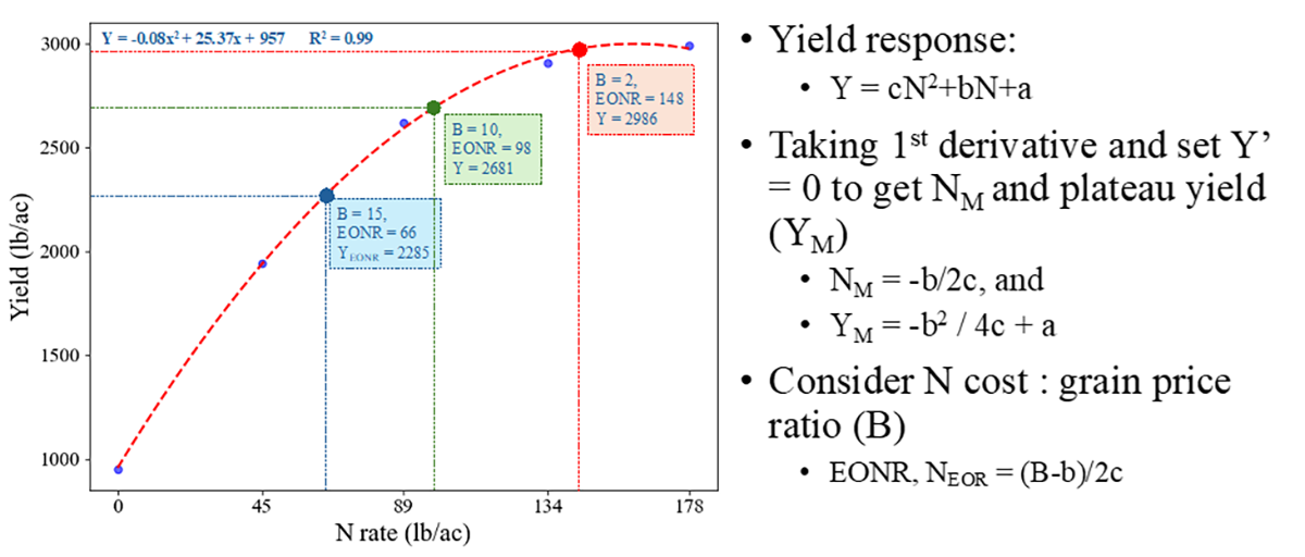 Yield responses to nitrogen fertilizer application generally follow a quadratic pattern. Therefore, EONR is calculated following the procedure shown in Figure 2.