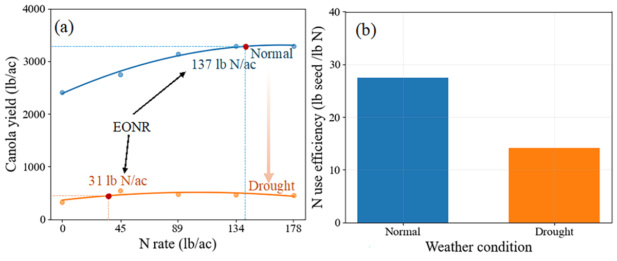 As a cool-season crop, canola is highly sensitive to heat and drought stress. Reduced precipitation limits root growth, and heat stress coupled with drought reduces stomatal conductance and photosynthesis, minimizing the formation of yield components such as silique number and seed weight, ultimately affecting crop productivity and quality (Biswas et al., 2019; Wu et al., 2018). Moreover, N fertilizers are typically applied before planting or before the crop begins to actively grow—a stage at which these physiological and metabolic responses have yet occurred (Ma et al., 2015, 2020; Ma & Zheng, 2016). These uncertainties make providing accurate and effective N recommendations particularly challenging.