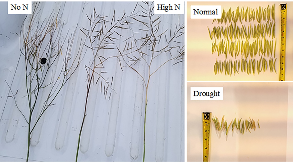 In this study, more than 40% of the studied sites-years experienced some degree of moderate to severe drought stress (total growing season rainfall <85% of the 30-year average). Interestingly, fields with high soil organic matter (SOM), such as those in Melfort (SK), Beaverlodge (AB), and Odds (AB), were able to buffer against mild to moderate drought stress and still increase yields with increased N input. This resilience is likely due to the soil’s superior water-holding capacity (Ma et al., 2015, 2020; Wen et al., 2023). However, under severe and extreme drought conditions, neither high SOM nor increased N application can prevent yield losses—canola yields may drop by up to 80% compared with those under optimal conditions (Wen et al., 2022, 2023). This occurs because dry soil restricts root growth and limits nutrient uptake (Wu et al., 2018), which in turn slows or even stops key physiological processes such as photosynthesis (Biswas et al., 2019), reducing plant pod and seed development (Figure 4; Wen & Ma, 2024).