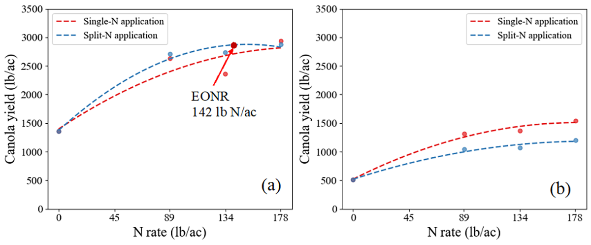 Split N application—dividing total N into a small initial dose and a second dose during the rapid growth phase of the crop—offers a promising strategy for reducing the risk of overfertilization and crop lodging (Wu & Ma, 2022; Wu et al., 2022) and matching crop growth and N uptake curves (Ma & Zheng, 2016), especially during seasons when drought or unpredictable weather is expected. The main advantage of this strategy is the flexibility to adjust topdressing according to in-season conditions. For example, under normal weather conditions (Figure 5a), such as at Beaverlodge in 2018, a split-N strategy increased canola yield by an average of 5% in 38 cases across 50 site-year environments compared with the single-N strategy at the same N rate. In comparison, Swift Current's two-year average EONR was only 31 lb N/ac (Figure 3a), meaning that an application of 45 lb N/ac at planting was sufficient to meet crop growth requirements without the need for additional topdressing.