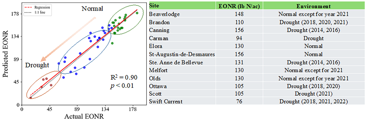 These findings highlight the need to tailor N application to site-specific conditions to achieve sustainable canola production. With its powerful predictive capacities, artificial intelligence (AI) is increasingly used in agriculture and shows great potential to provide precise early-season N recommendations (Wen & Ma, 2024). In this study, we developed AI models using historical weather (e.g., past 10 years of precipitation), soil, field management (fertilizer rate, preceding crop, etc.), and crop growth data (leaf chlorophyll content and NDVI) to predict site-specific EONR for hybrid canola (Wen et al., 2021, 2022). Among the models tested, random forest performed best with an R² of 0.90 and a relative error of 2% compared with the EONR value calculated from the yield–N response curve (Figure 6). This shows that the AI-based model effectively classified seasonal rainfall and adjusted N recommendations accordingly, especially under moderate to favorable rainfall conditions.