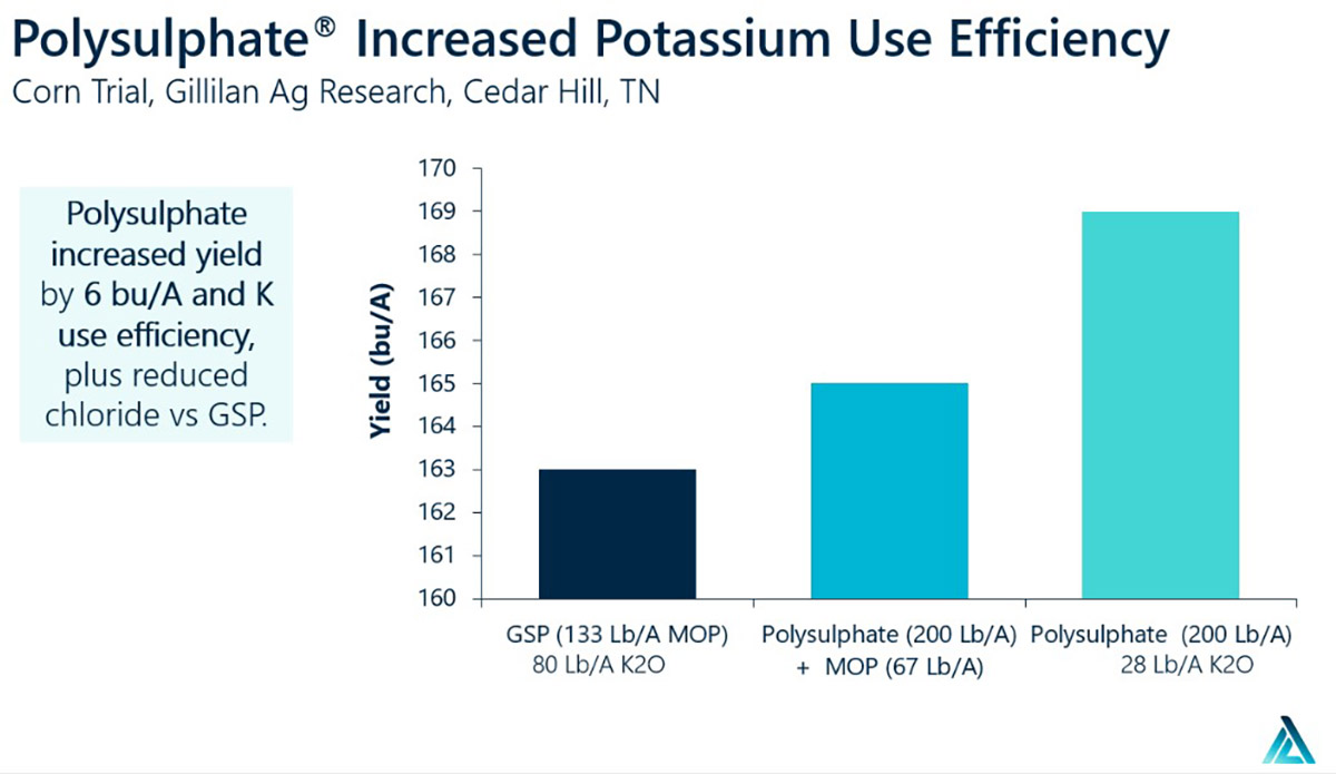 Comparative work evaluating potassium sources has shown that polyhalite can deliver equivalent yields at substantially reduced K₂O rates relative to muriate of potash (MOP) in specific systems. In some reported trials, similar yield was achieved with up to 65% less applied K₂O, suggesting improved potassium efficiency when delivered alongside sulfate, calcium, and magnesium.