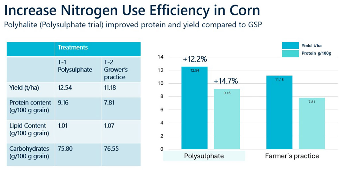 By supplying sulfate-based S, Ca, K, and Mg in synchrony with nitrogen uptake, polyhalite can enhance protein formation and reduce inefficiencies associated with unbalanced N fertilization.