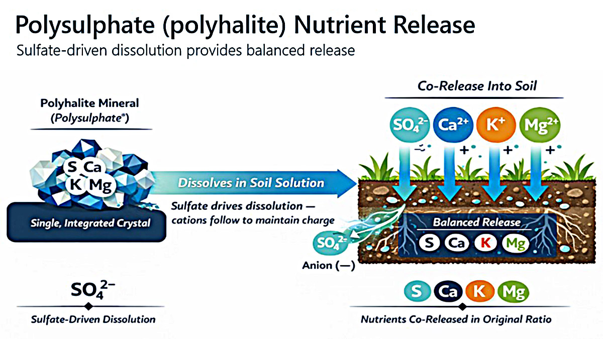 Unlike highly soluble single-nutrient fertilizers, polyhalite dissolves gradually in response to soil moisture. This dissolution pattern provides a season-long supply of sulfate-S along with accompanying base cations. As a result, polyhalite functions as a natural slow-release, multi-nutrient fertilizer suited to improving whole-system nutrient efficiency.