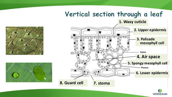 The outer surface of the cuticle is covered by waxes that may confer a hydrophobic character to the plant’s surface (Figure 1). The degree of hydrophobicity and polarity of the plant surface is determined by the species, chemistry, and topography which are also influenced by the epidermal cell. Like leaves, fruits are also protected by a cuticle. The shape, chemistry (waxes, polysaccharides), leaf hairs, and ability of the leaf to assimilate and mobilize nutrients all play a role in efficacy.