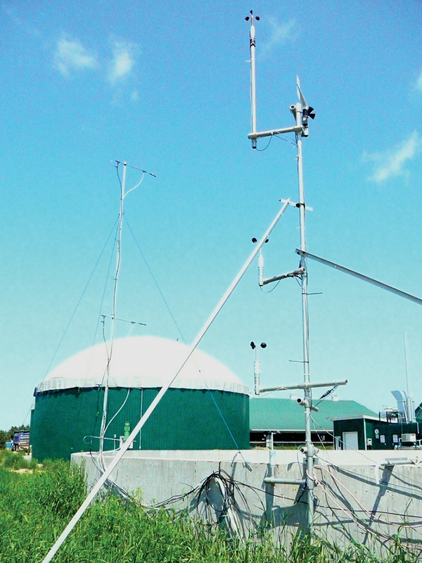 The team partnered with a local dairy farm with about 150 cows, about an average farm size in Ontario, Wagner-Riddle says. Prior to the AD system being installed, she and her colleagues set up 4.5-m-tall towers around the farm to track concentrations of methane every half hour around the clock. The area of prime interest was near the 30-m-diameter cylindrical holding tank for the manure. The reactors were installed a little over a year after the team started tracking methane. The system now involved the AD reactors where manure and off-farm food waste were mixed and held at a constant temperature to promote biological activity as well as the tank where the byproduct digestate (a nutrient-rich slurry that can be used as fertilizer) was stored after leaving the reactors.
