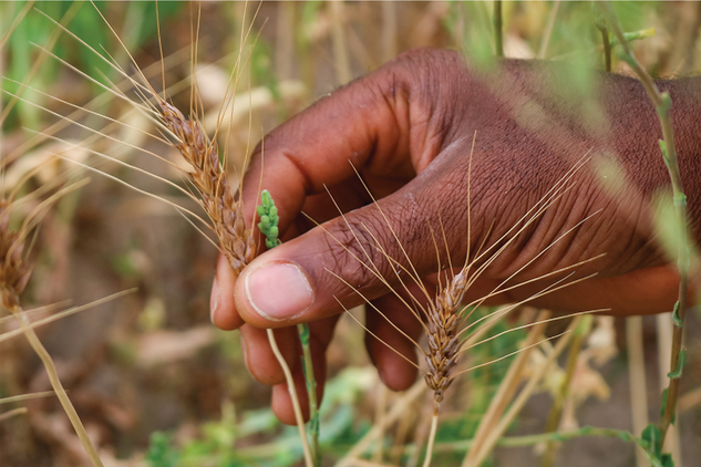 Improving organic wheat yield—the increase in demand for organic grains has prompted farmers to seek ways to ensure higher and consistent wheat yields. A graduate student examines a wheat grain in a dryland organic wheat field for harvest.