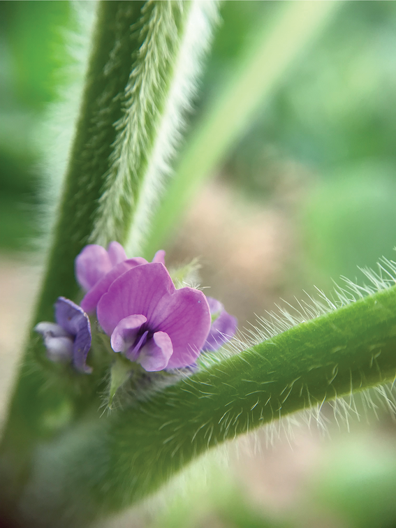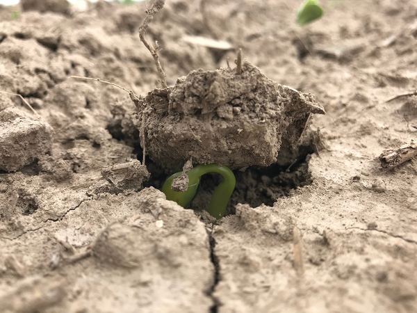 Heavy rains after planting left this soil with a crusted surface. The hypocotyl is the structure of the soybean plant that lifts and pulls the cotyledons up through the soil surface. The hypocotyl on this particular soybean plant needed to work extra hard to push through the crusted soil.
