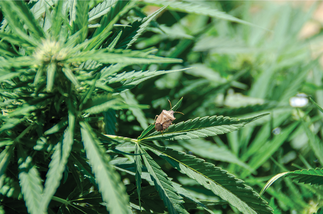 Since few pesticides are labeled for hemp production, growers must look to biocontrol and other integrated pest management strategies for pests like this brown marmorated stinkbug (Halyomorpha halys). Virginia Tech has hemp trials for CBD, fiber, and seed to help farmers diversify practices and adapt to this specialty crop.