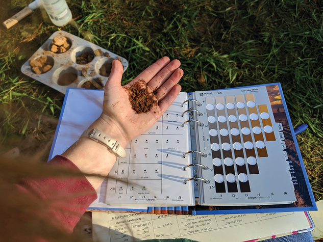 A Munsell Soil Color Book, muffin tin, spray bottle, and soil knife can be seen helping this soil judger with her analysis. However, the focus of this photo is something we don’t always consider to be a tool, but certainly is: the human hand.