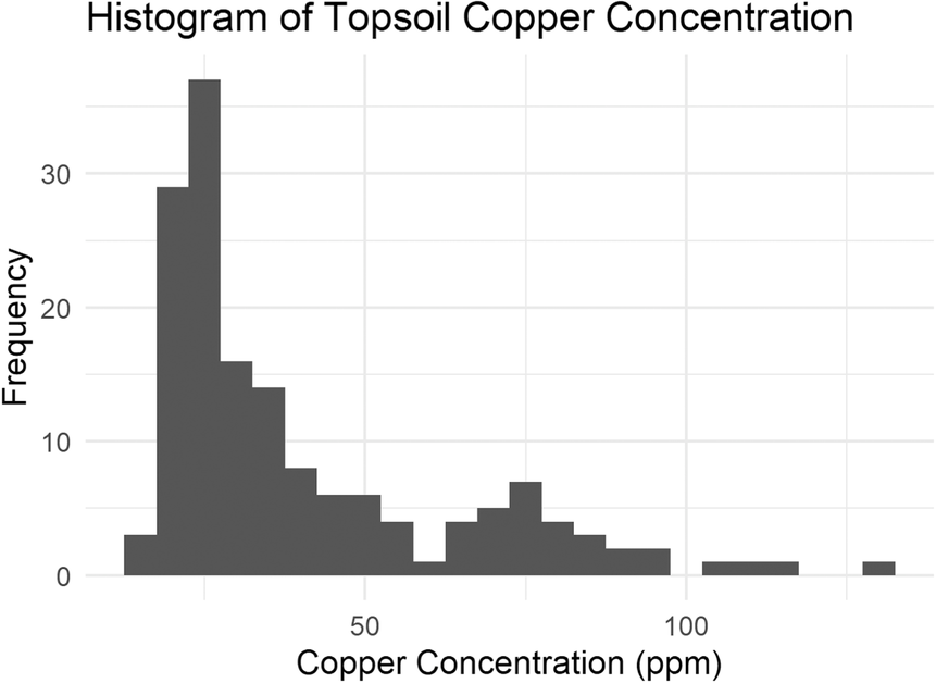 Single continuous variables are commonly visualized using histograms. Histograms allow you to see the arrangement of the data (i.e. skew, distribution, etc.). With this type of graphic, you are able to check the normality of your data distribution. For initial data visualization, the hist() function in R or the geom_histogram within the package ggplot2 can be useful. We have continued using the meuse data set for these examples, which include topsoil heavy metal concentrations in the floodplain of the river Meuse as well as elevation and land use observations. The copper concentration displayed in Figure 2 would be described as unimodal and skewed right. If you were going to continue analysis of this data further, it may require transformation before pursuing statistical methods that assume normal data distributions such as t-tests.