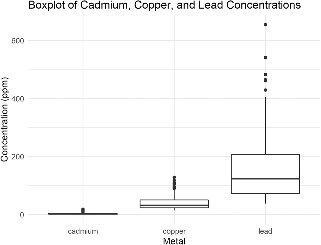 When a dataset has a continuous variable and a categorical variable, a box plot (Figure 3) or violin plot (Figure 4) might be appropriate. Violin plots can assess the normality of individual categories (similarly to a histogram) while box plots make it easy to compare the spread of your data across categories. In the example graphics shown below, both the violin plot and box plot of the topsoil concentration of heavy metals show that lead has the largest spread.