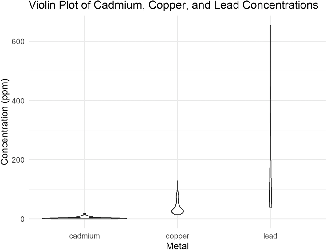 Depending on the structure of your data set, you may have multiple categories of data you're interested in comparing. Note in Figure 4 that the violin for cadmium is much wider than the violin for lead, which indicates there are many samples with the same concentration of cadmium as each other. Figure 4 shows few samples with the same concentration of lead while Figure 3 does not show any information regarding frequency. Both Figures 3 and 4 show the range of lead concentrations is much wider than the range of cadmium or copper concentrations. Although not shown in the box plot or violin plot examples, two categorical variables can be displayed in both violin plots and box plots by grouping boxes using different colors if desired.