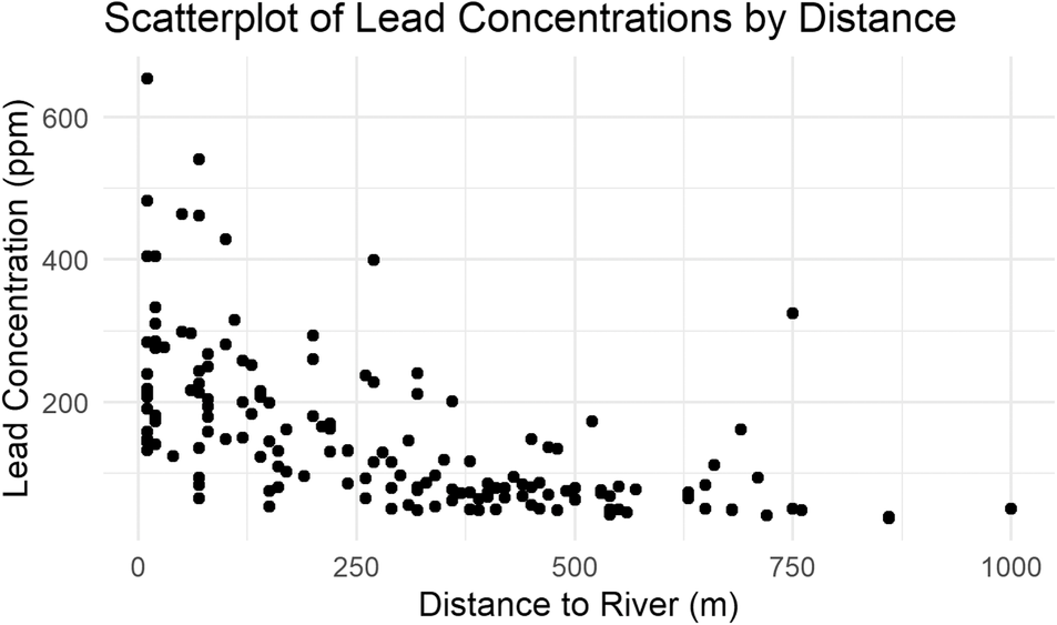 In a scatterplot, two continuous variables are visualized against one another. These plots can display a variety of relationships (e.g., linear, exponential, logarithmic, etc.) that might inform the next steps in evaluating your data or the analysis that you should use. Figure 5 plots the lead concentration in topsoil at a variety of distances from the river Meuse. If you were analyzing this data set, a scatterplot would be helpful for recognizing that the relationship between these variables is not linear. Variables with nonlinear relationships will have Pearson's R values that underestimate the strength of the relationship, which you may need to transform before including them in multivariate linear modeling.