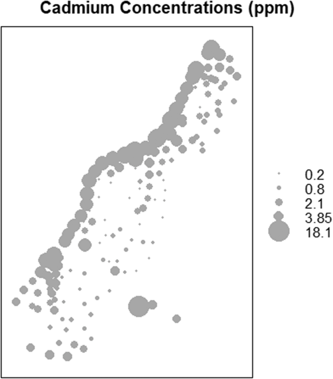 Visualizing spatial data is also important for assessing patterns. Plotting point data over a map of field boundaries, counties, or other features appropriate for the scale of your study is a useful way to assess the spatial distribution of your data. If you have data that has both a spatial and numeric or categorical component, you can plot data using colored markers to help identify trends in both data location and value. Plotting continuous data using a range of marker sizes instead of a gradient of marker color can also be a great way to identify locations in your study region with clusters of high or low values. This example of soil cadmium concentrations in the floodplain on the southeast side of the river Meuse was generated using data from the R package sp and the bubble function, also in sp. The large, overlapping bubbles help visualize the high cadmium concentrations along the river bank.