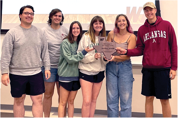 The 2021 Region IV Soil-Judging Contest was hosted by West Texas A&M University in Randall County, TX on 14 Oct. 2021. A total of 35 students participated in the contest, representing six institutions from the region, including the University of Arkansas, Oklahoma State University, Tarleton State University, Texas A&M University–Kingsville, Texas Tech University, and West Texas A&M University. The University of Arkansas finished first overall, followed by Tarleton State University in second, and Oklahoma State University in third. Four of the top five individuals were from the University of Arkansas: Lauren Gwaltney (first), Jonathan Brye (second), Katie Jansson (fourth), and Lilly Stults (fifth). The third-place individual was Austin Wildman from Tarleton State University. Pictured are the first-place overall team from the University of Arkansas, coached by Dr. Kris Brye, and the top five individuals.