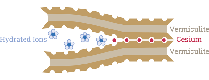 Ferreira and Thornhill measured this using X-ray diffraction of vermiculite with either cesium or water in its interlayer. They found that pure vermiculite soaked in water has an interlayer of 3.25 angstroms while the cesium chloride–soaked clay has an interlayer of a mere 1.20 angstroms. Angstroms are equal to one hundred-millionth of a centimeter—a measurement on the atomic level. In effect, the team showed how Cs binds both sides of the clay interlayer so tightly that it decreases the gap by two-thirds, effectively sealing it off.