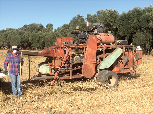 “We have this old rubber roller thresher from the ‘60s, and once the beans were dry, we went around and threw them into the tray of the thresher, five feet off the ground,” Palkovic says. “When we were testing heirlooms, some were very viny and non-senescing, and they didn’t even dry after we windrowed them. They were so heavy, and the thresher really wasn’t equipped to deal with that kind of wet material.”