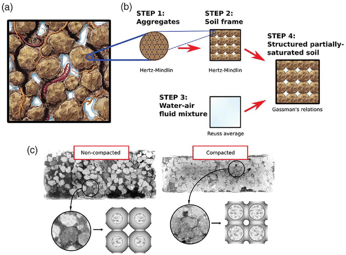 The model makes a few assumptions. It represents soil aggregates as little spheres with internal porosity and varying elastic properties depending on their makeup and wetness. The “soil” in the model is formed by considering a package of these little spheres, like looking through a picture frame at a cartoon handful of aggregates. For non-compacted soils, these little spheres have big gaps between them, which represent larger pore spaces. In compact soil, the team imagined the spheres squished together with less pore space. The decrease in pore space increases their mechanical contact areas, which changes how they transmit P-waves (compressional waves) through the soil. They also assumed that the entire pore space is occupied by a mixture of water and air. In their mathematical model, they considered the water–air mixture an effective fluid to better estimate how it impacts the speed of a P-wave.