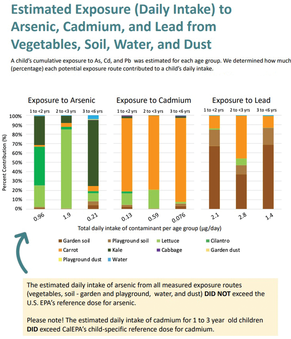 As for the vegetables, the team compared arsenic, lead, and cadmium concentrations in preschool-grown veggies to store-bought samples. They found that preschool-grown carrots were higher in concentrations of all three metalloids while lettuce accumulated more arsenic and lead and cabbage accumulated more arsenic and cadmium. Cilantro and kale accumulated arsenic at higher levels, as well.