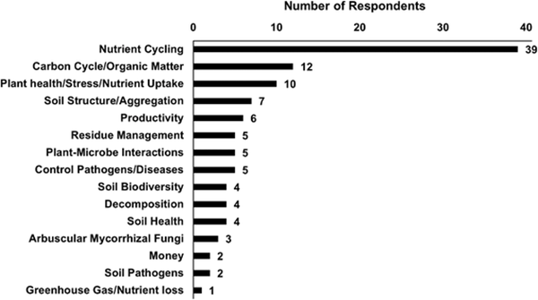 Nutrient cycling (especially nitrogen and phosphorus) was identified by 39 respondents as the most important function that farmers or service providers should be aware of (Figure 1). The next most important function was carbon cycling and building organic matter with 12 responses. Alleviation of plant stress and aiding in plant nutrient acquisition was the third most important function identified by 10 respondents. Functions related to suppressing or causing plant diseases, soil health, and greenhouse gas emissions/nutrient losses were noted but had fewer responses.