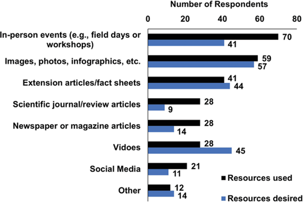 Respondents were asked about resources that they have found helpful in the past and what resources they wish they had more of when communicating information about soil microbes (Figure 2). The top three resources that respondents had used and considered helpful were in-person events, images/photos/infographics, and extension articles or factsheets.