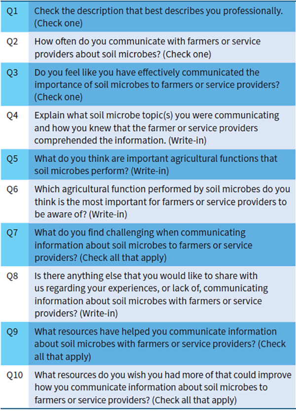 Qualtrics survey software was used to develop an online questionnaire for distribution to known groups of professionals who provide farmer-based educational programs focused on soil health management. Service provider groups included those from University Cooperative Extension, USDA-NRCS, soil and water conservation districts, non-profit organizations, crop consultants, and professionals associated with ASA’s Soil Health Community and SSSA’s Soil Biology and Biochemistry Division. Email or digital platforms were used to distribute an invitation to known groups inviting them to participate using the questionnaire link. Participation was voluntary.