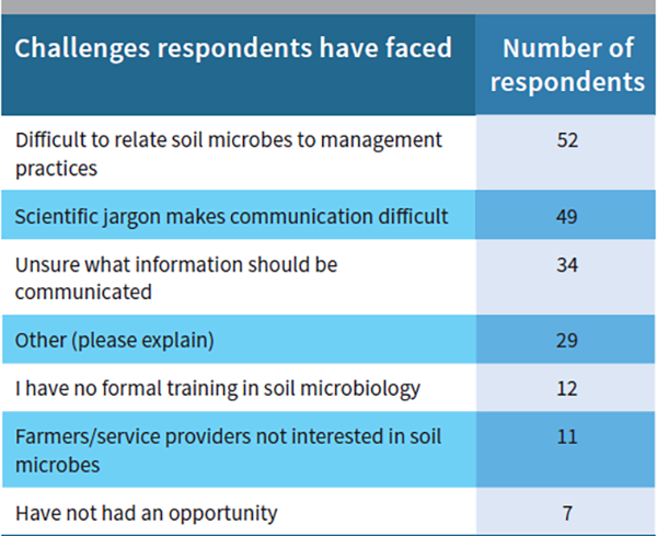 Table 2. Questionnaire responses to the “check all that apply” question “What do you find challenging when communicating information about soil microbes to farmers or service providers?”