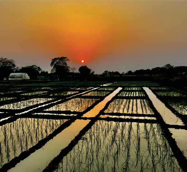 The photo depicts a rice field after transplanting as part of a preliminary yield trial experiment on a farm in West Bengal, India. In yield trial experiments, a set of cultivars are assessed for varietal recommendations.