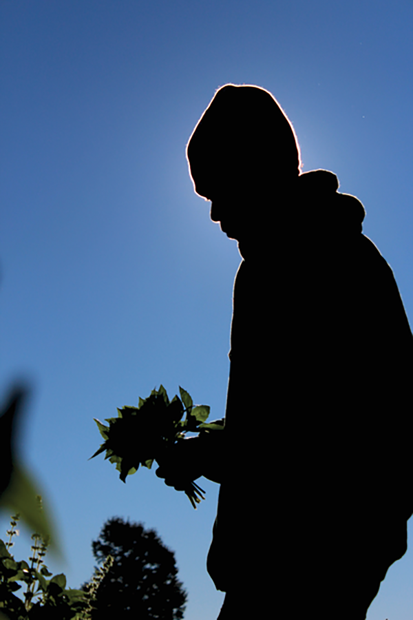 The silhouette of the farmer holding basil represents the peaceful offering that farmers present to people globally. With farmers like this giving a whole-hearted effort to produce, the fight for food should not have to be a fight.