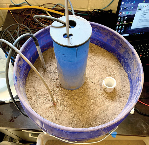 In 2021, Scott et al. published a study in SSSAJ that found that IRIS coatings are removed from clear tubes just as well as PVC (https://doi.org/10.1002/saj2.20171). The study spurred Knappenberger to try using a clear rhizosphere tube, cut down to a bit taller than bucket height, coated on the outside with both iron and manganese paint in four broad stripes. Along with LeFevre, he installed the camera inside it, nested the rhizosphere tube in the bucket, and filled the bucket with 8 cm of washed sand and another 20 cm of wetland soil on top of that. They sourced the soil from a surface horizon (57% sand, 27% silt, 19% clay, and 1.7% soil organic carbon). They added some peat moss for good measure, creating an additional carbon source. Finally, they saturated the soil with water, feeding it from a pipe at the bottom of the bucket. They maintained a steady water level near the top of the bucket throughout the study.