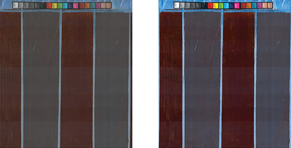 Here is an example of iron (Fe) and manganese (Mn) images from the laboratory setup on the left. The top sections show the oxide paint while the bottom sections are areas with the paint removed. The greyscale images on the right show channels in the CIE L*a*b* color space. Image by Thorsten Knappenberger.