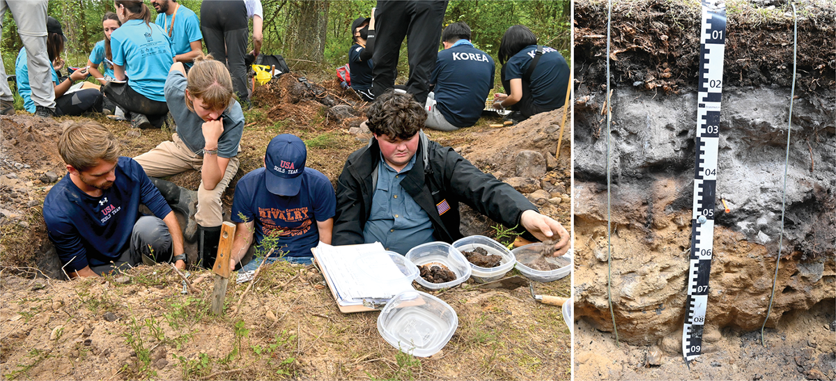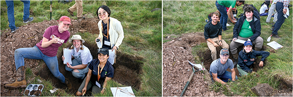 The International Soil-Judging Contest occurs every four years in conjunction with the World Congress of Soil Science. Contestants are students and early career professionals. In the U.S., students qualify to be on the team by placing as the top finishers at the National Collegiate Soils Contest sponsored by SSSA and ASA. The student representatives were Ben Atkins (Virginia Tech), Curtis Murphy (North Carolina State University), Isaac Nollen (University of Wisconsin–Platteville), Kennadi Griffis (University of Nebraska–Lincoln), and Clare Tallamy (Virginia Tech). Dr. John Galbraith and I were fortunate enough to serve as their coaches. The U.S. team, newly formed in April, studied soil classification and Scottish soils all summer. The first time we met in person was over a dinner of haggis, neeps, and tatties at the University of Stirling in late July.