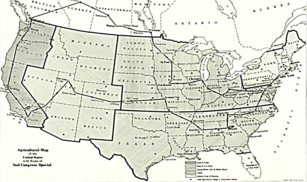 Traveling by a specially designated train, the group examined soils from east to west across the continent. The journey began in Washington, DC with stops in the coastal plains, followed by investigations of Midwest prairies, particularly the chernozems (Mollisols, U.S. Soil Taxonomy) of Illinois and Iowa. The tour continued through the arid western soils of Colorado and California with a side trip into Canada to study boreal and prairie soils. Activities throughout the tour included lectures, examination of soil pits, and discussions focused on erosion and fertility.
