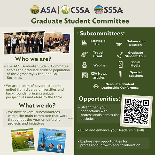 This article is a contribution of the ASA, CSSA, and SSSA Graduate Student Committee. If you would like to provide feedback to this committee on its work or want to volunteer with the committee, please reach out to Bala Subramanyam, the 2026 Chair of the committee!