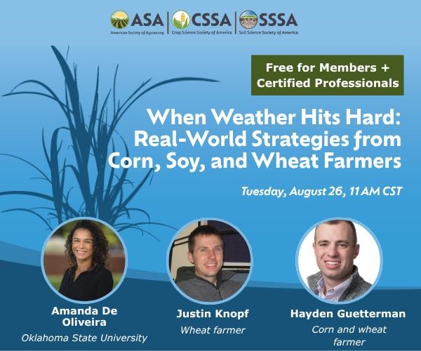 The second webinar, “When Weather Hits Hard,” featured an outstanding panel discussion focused on the challenges facing farmers and their future solutions. Panelists included Kansas farmers Justin Knopf and Hayden Guetterman, along with Amanda de Oliveira, Oklahoma State University extension specialist. This engaging discussion provided valuable, real-world perspectives on agricultural challenges, innovation, and sustainability from both producer and university extension viewpoints.