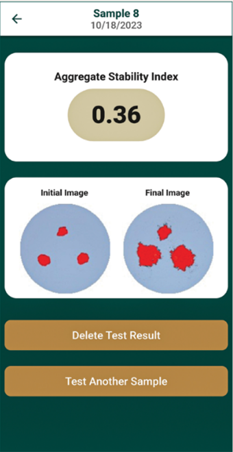 The Slakes app enables reliable field-, kitchen-, or classroom-based quantification of soil structure through image-based analysis. The free app is available on both Google Play and the App Store. The Slakes app works by using a smartphone camera to photograph three dry soil aggregates before and after a 10-minute water exposure. Through automated image analysis, the app measures the aggregates' ability to resist dispersion when rewetted. Weaker aggregates slake or break apart more easily while stronger aggregates remain intact, indicating better soil aggregation and healthier soil structure. The app automatically calculates an aggregate stability index value that can be exported and tracked over time to compare management practices (Figure 1).