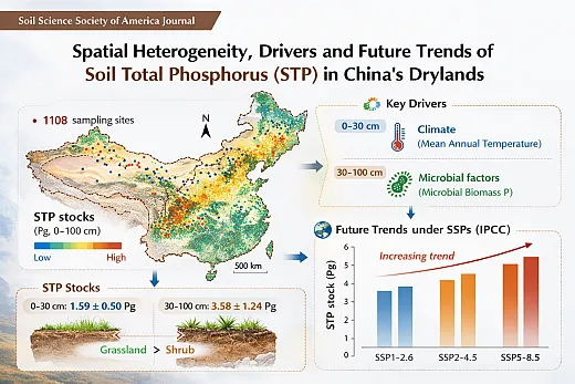 Researchers compiled soil phosphorus data from more than 1,100 sites across China’s drylands and tested five machine learning models to map where phosphorus is stored and identify what controls its distribution. The best performing model revealed that surface soil phosphorus (0–30 cm) is primarily driven by temperature, while deeper phosphorus (30–100 cm) is more closely linked to microbial activity. In addition, the findings show that grassland soils hold the largest phosphorus stocks compared to other dryland land types, and that stocks are likely to increase under future climate scenarios. This new high-resolution map provides a critical baseline for guiding fertilization, restoring degraded soils, and managing phosphorus sustainably in China’s drylands under global change.